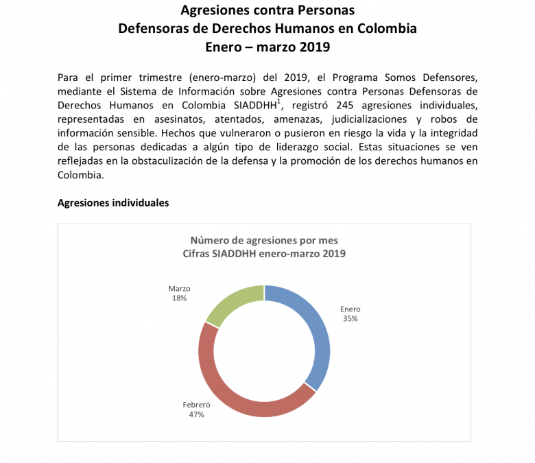 A pesar de la gravedad del asunto y de las decenas de vidas que fueron arrebatadas durante el 2018, siguen faltando acciones para garantizar el ejercicio de la defensa de los derechos humanos en los territorios, lo que se demuestra en la alta cantidad de agresiones registradas en el primer trimestre del 2019.